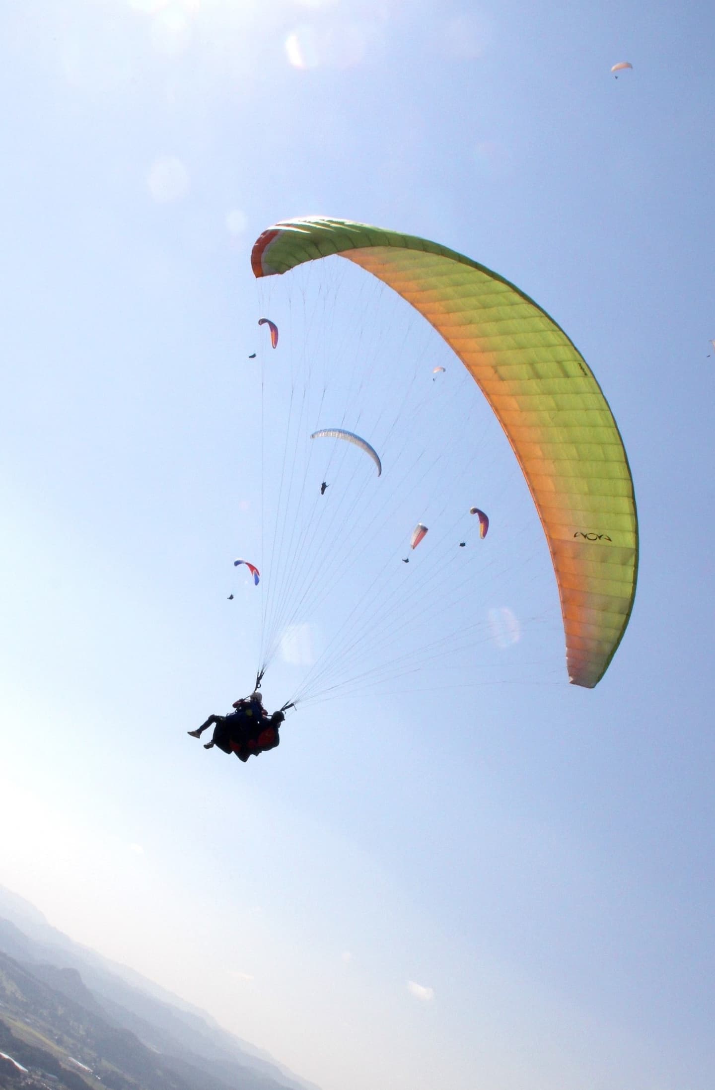 ナイロンなどの生地と紐でできている翼で、自然の気流を利用して大空を楽しみます。両手に持っているブレークコード(ハンドル)で進行方向はコントロールでき、目的の場所に着地できます。エンジンはありません。