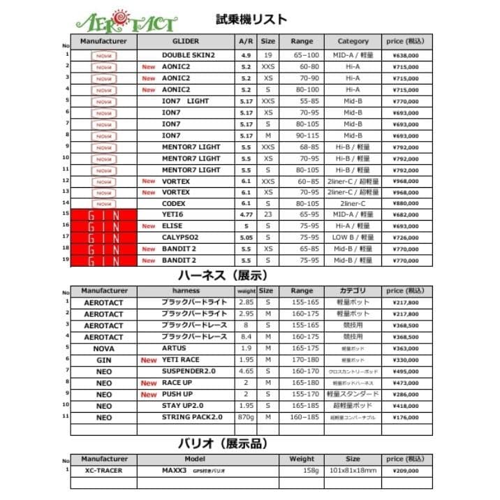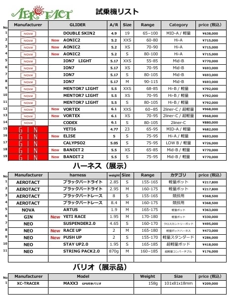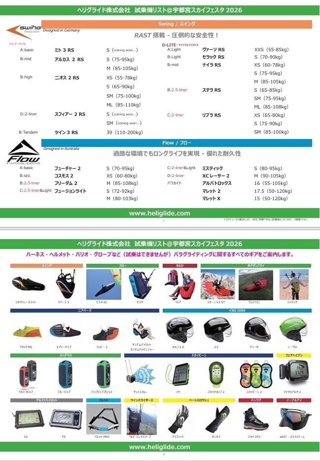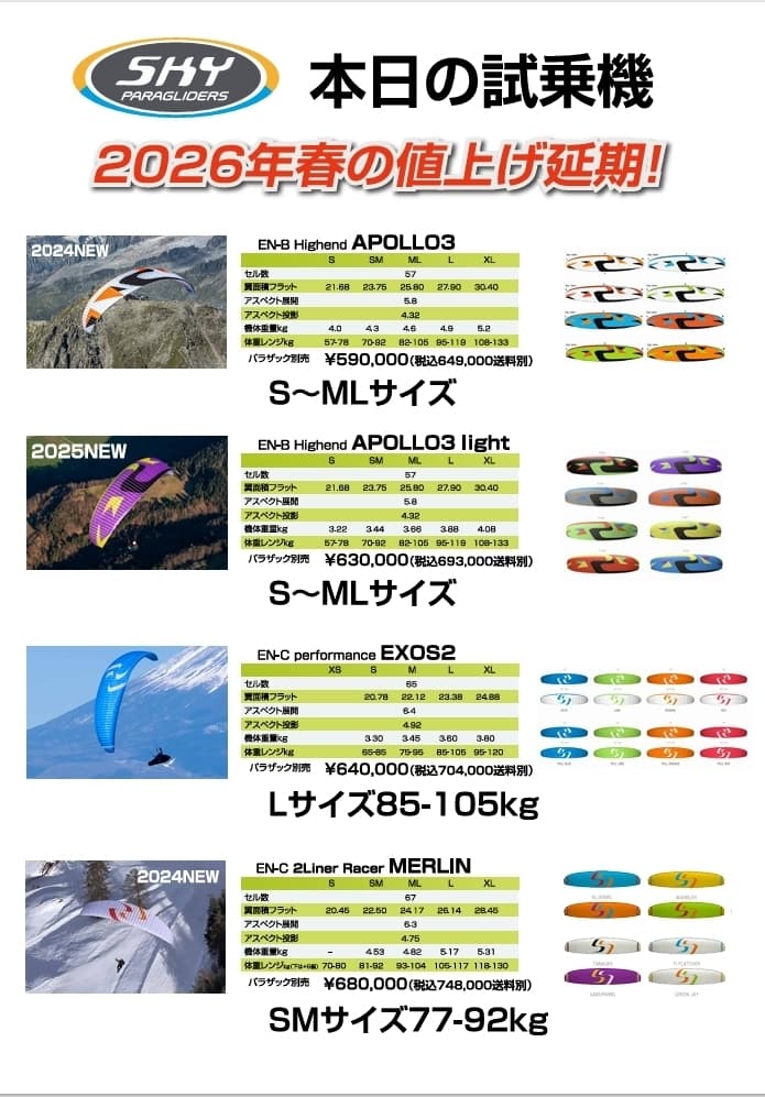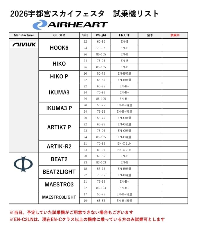 | 試乗機の取扱について | パラグライダー機材はご自分の命を預ける大切なパートナーとなります。メーカーからお借りする試乗機もご自分の機体以上に大切にお取扱い下さい。 |