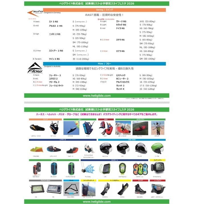 | 試乗機の取扱について | パラグライダー機材はご自分の命を預ける大切なパートナーとなります。メーカーからお借りする試乗機もご自分の機体以上に大切にお取扱い下さい。 |