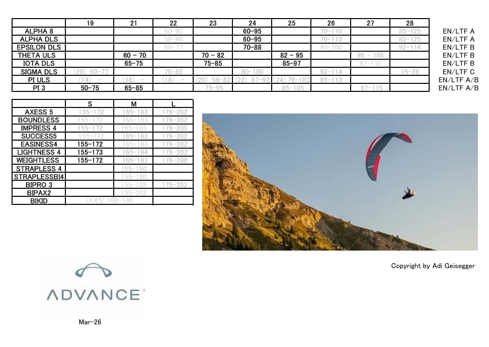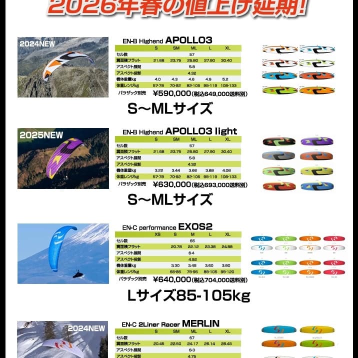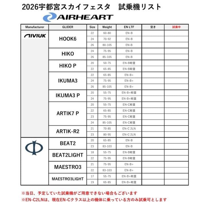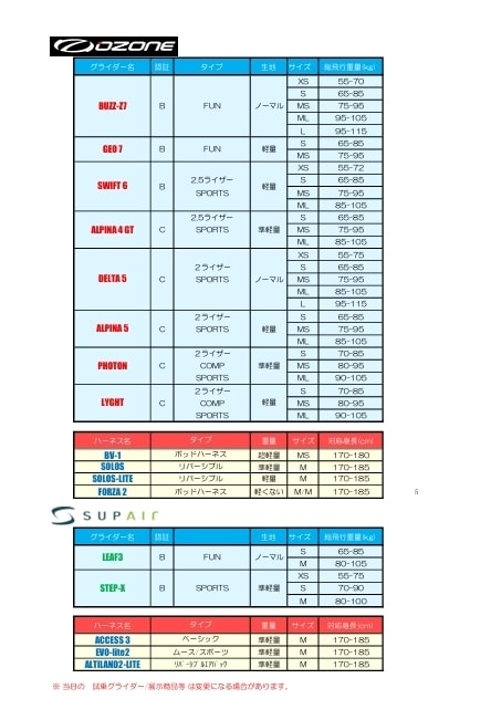 | 試乗機の取扱について | パラグライダー機材はご自分の命を預ける大切なパートナーとなります。メーカーからお借りする試乗機もご自分の機体以上に大切にお取扱い下さい。 |