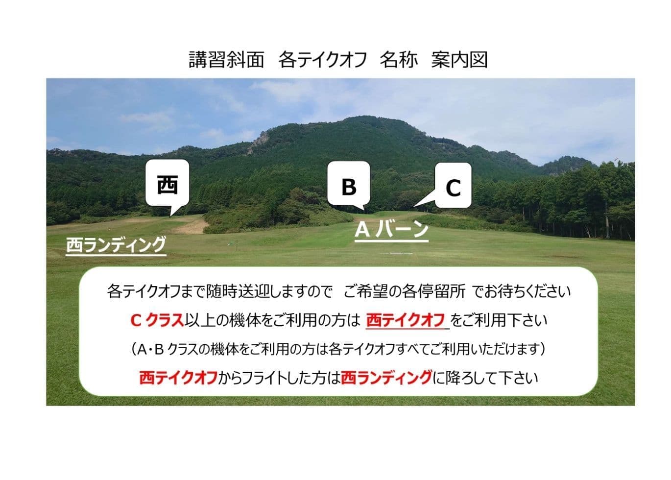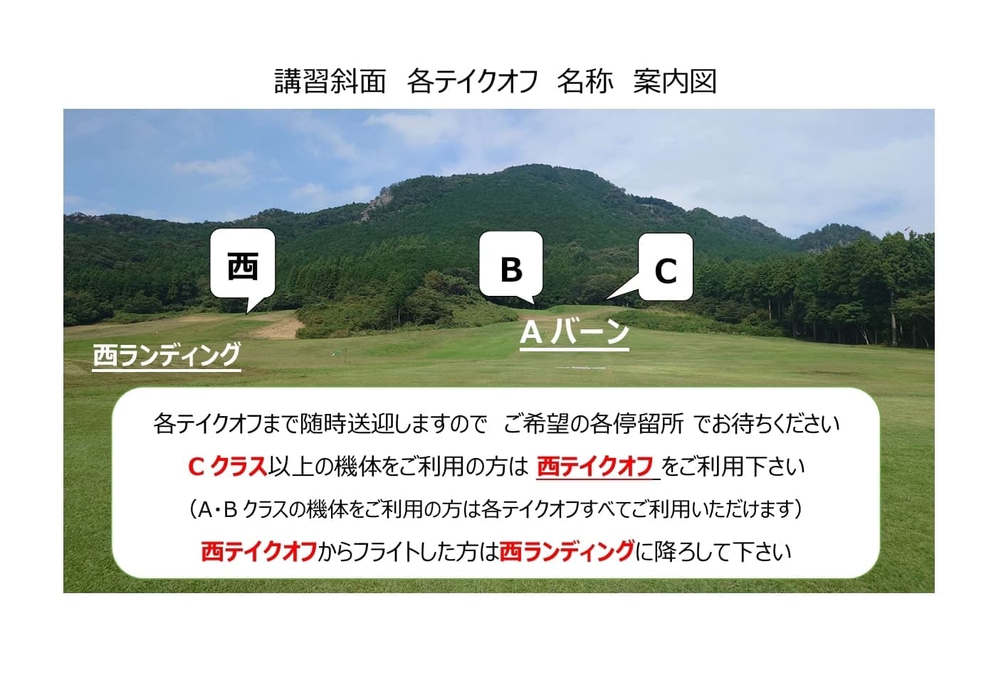 ※試乗は講習斜面をご利用下さい。受付・講習斜面・ランディングが1ヶ所にまとまっていますので、短時間で多くのショートフライトを楽しんでいただけます。離陸箇所は4箇所、講習場内は無料で送迎いたします。待ち時間が極力ゼロに近くなり、連続して試乗できますので時間を有効に活用できます。
